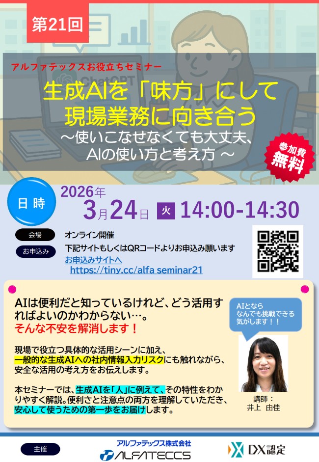 【第21回】生成AIを「味方」に現場業務に向き合う ~AIの使い方と考え方~/お役立ちセミナーのご案内(3/24)